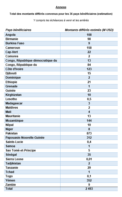 Pour ces 36 pays, le montant total différé convenu par les créanciers du Club de Paris grâce à l’ISSD - incluant également le report d’arriérés préexistants à la mise en œuvre de l’ISSD - atteint 2,5 milliards de dollars (cf. annexe).
