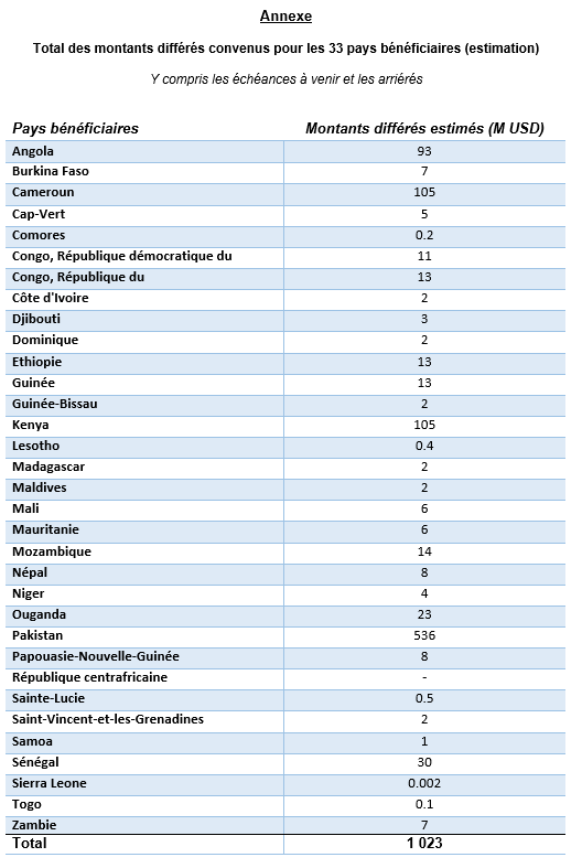 Pour ces 33 pays, le montant total différé par les créanciers du Club de Paris grâce à l’extension de l’ISSD atteint 1 milliard de dollars (cf. annexe).