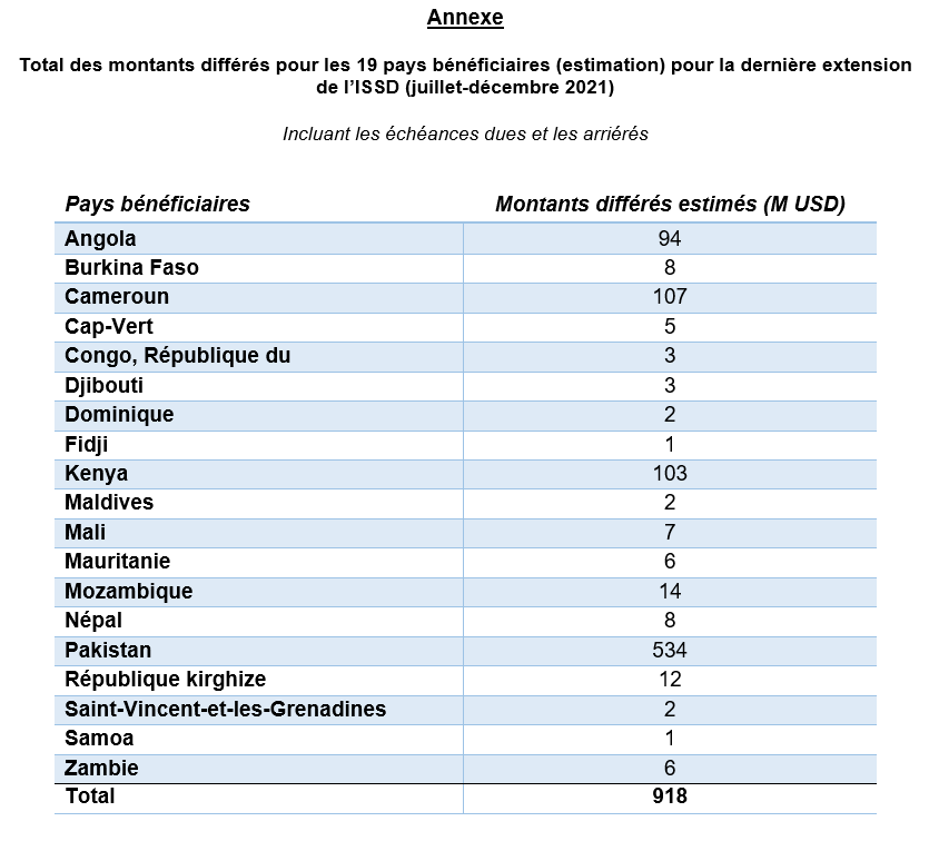 À ce jour, 32 pays éligibles ont demandé à bénéficier de la dernière extension de l'Initiative de suspension du service de la dette (ISSD) par le Club de Paris. Parmi ces pays demandeurs, 19 ont déjà signé un accord avec le Club de Paris pour mettre en œuvre la dernière extension de l’ISSD du 1er juillet au 31 décembre 2021. Ces pays sont : l’Angola, le Burkina Faso, le Cameroun, le Cap-Vert, Congo (la République du), Djibouti, la Dominique, les Fidji, le Kenya, les Maldives, le Mali, la Mauritanie, le Mozambique, le Népal, le Pakistan, la République kirghize, Saint-Vincent-et-les-Grenadines, les Samoa et la Zambie.