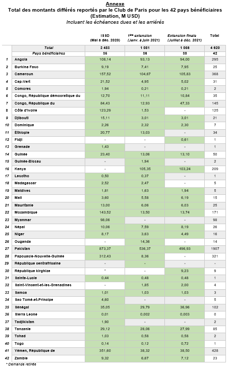 Le Club de Paris a pleinement mis en œuvre son engagement d’accorder une suspension du service de la dette à tous les pays éligibles qui en ont fait la demande. Du 1er mai 2020 au 31 décembre 2021, les créanciers du Club de Paris ont signé un accord pour suspendre environ 4,6 milliards de dollars de service de la dette dû par 42 pays à faible revenu (cf. annexe). Le Portugal et la Turquie, qui ne sont pas membres du Club de Paris, ont signé conjointement avec ce dernier des accords mettant en œuvre l’ISSD et/ou son extension. La Turquie a participé à la réorganisation de la dette de la République du Congo et le Portugal à celle du Cap-Vert et de Sao Tomé et Principe.