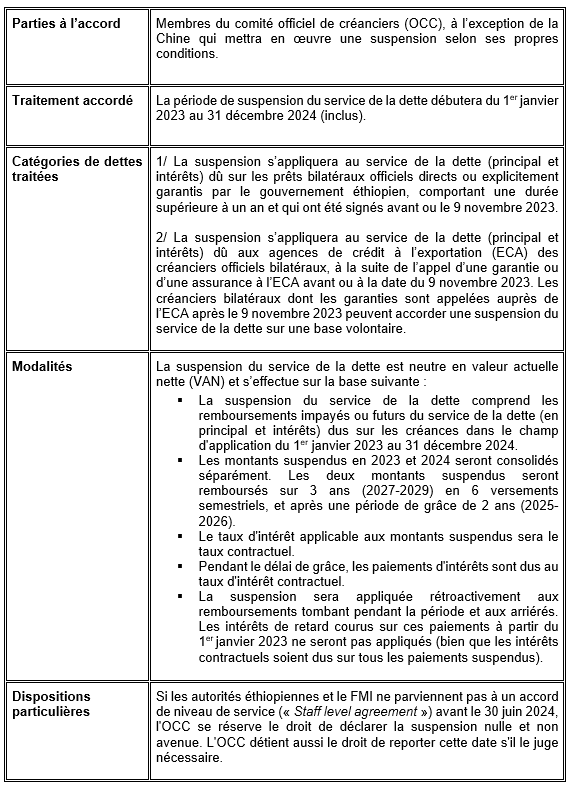 En complément de l'accord bilatéral entre la Chine et l'Éthiopie, un accord entre les autres créanciers bilatéraux officiels et l'Éthiopie a été coordonné par le comité officiel des créanciers (OCC) de l'Éthiopie au titre du Cadre Commun. Le comité officiel des créanciers est coprésidé par la France et la Chine. Les conditions de cet accord coordonné par l'OCC ont été conclues avec les autorités éthiopiennes le 23 novembre 2023, et suspendront le service de la dette dû en 2023 et 2024 en des termes comparables à ceux mis en œuvre dans le cadre de l'initiative de suspension du service de la dette (ISSD).
