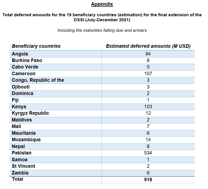 As of today, 32 eligible countries have requested to benefit from the final extension of the Debt Service Suspension Initiative (DSSI) by the Paris Club. Of these requesting countries, 19 have already signed an agreement with the Paris Club to implement the final extension of the DSSI from July 1 through December 31, 2021. These countries are: Angola, Burkina Faso, Cabo Verde, Cameroon, Congo (Republic of the), Djibouti, Dominica, Fiji, Kenya, Kyrgyz Republic, Maldives, Mali, Mauritania, Mozambique, Nepal, Pakistan, Saint Vincent and the Grenadines, Samoa and Zambia.