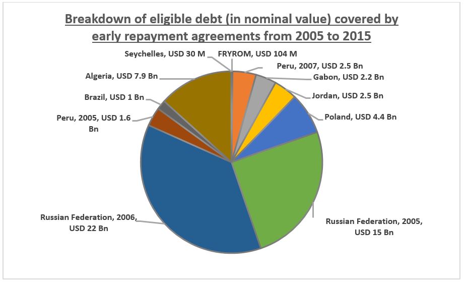 The bulk of early repayment operations in the Paris Club took place between 2005 and 2007: Poland, Brazil, Russia, Algeria, the Former Yugoslav Republic of Macedonia, Peru, Gabon and Jordan offered early repayments of around USD 70 billion of debt in face value in 2005, 2006 and 2007. Only one other agreement was made with the Seychelles in 2015.