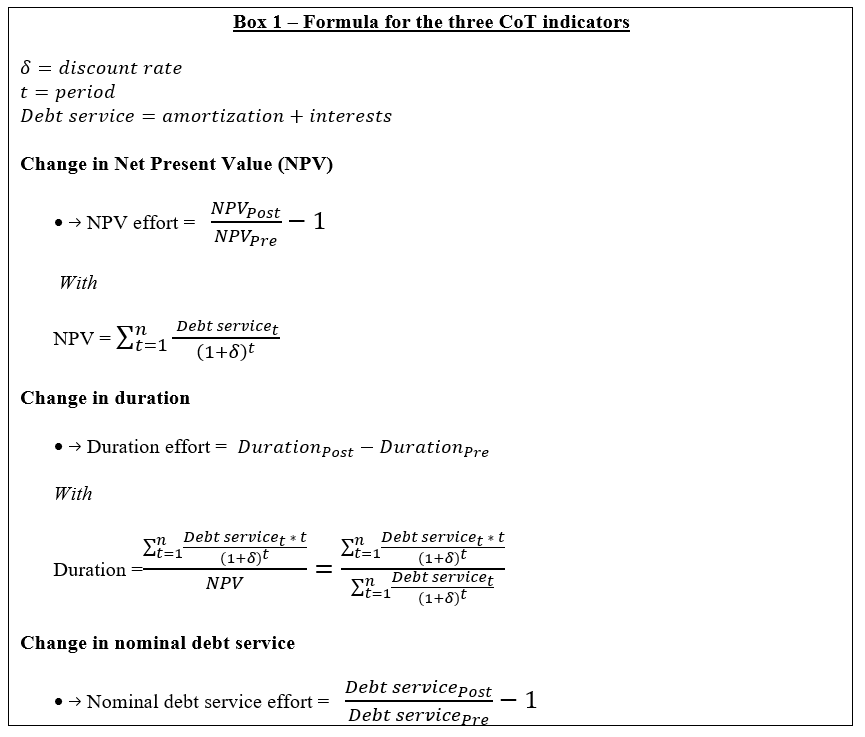 This is also why, even though the efforts in terms of duration and reduction of debt service over the IMF program period are to some extent reflected in the calculation of the NPV, it is important to carry out the CoT assessment based on the full combination of the three criteria. The three criteria together allow for a reflection of the preferences of the various types of creditors, as well as giving those creditors the incentive to provide the debt relief needed to meet the various IMF targets (usually stock and flow), especially during the program period. In addition to those financial provisions, other non-financial provisions can impact the CoT assessment if they can alter the agreed debt treatment.