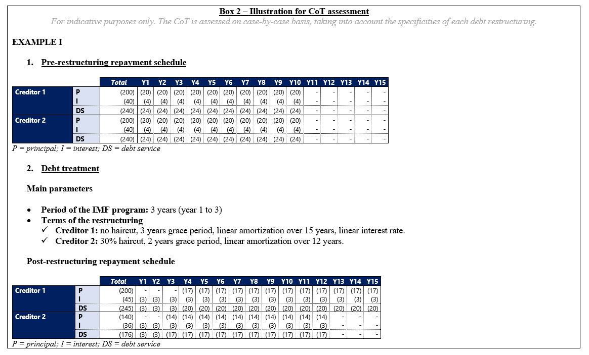 - Additionally, CoT significantly helps the borrowing country in its negotiation with its other creditors by setting an expected benchmark of effort required by those creditors, provided that the IMF Lending Into Arrears (LIA) policy applies. Indeed, the borrowing country’s third-party creditors will remain in arrears as long as they do not reach a debt restructuring agreement with the debtor country. Third-party creditors remaining in arrears does not impede the progress of an IMF program (including ongoing IMF disbursements), so long as the debtor continues to negotiate in good faith with those creditors. The CoT does not interfere in the debtor’s sovereign strategy towards each specific creditor group, as long as the overall creditor effort complies with the IMF program parameters.