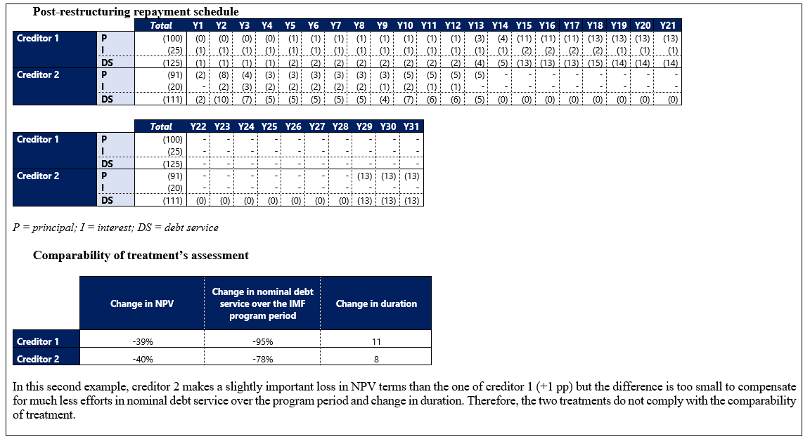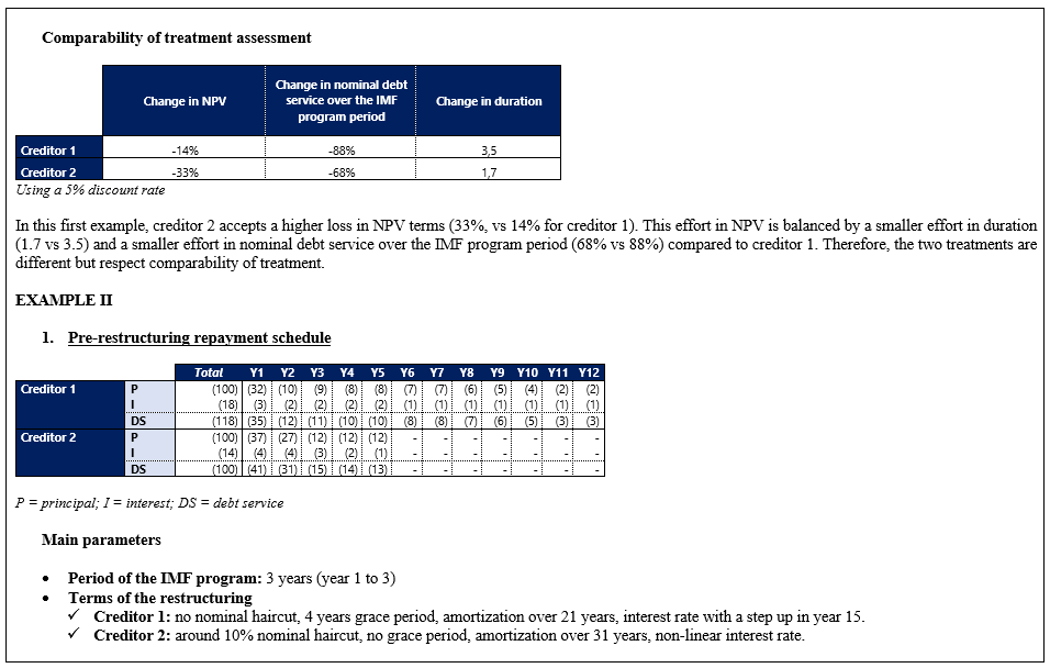 - Firstly, it mitigates the risk of moral hazard, reducing the incentive for each group of creditors to wait for other creditors to restructure the country’s debt. With the CoT clause, public creditors can proactively move forward and agree on a debt treatment necessary for the IMF Board to approve a program, or disburse new financing associated with a program review, without the concern that they will bear an undue burden compared to other creditors, and in effect subsidize through their efforts a smaller effort from other creditors.