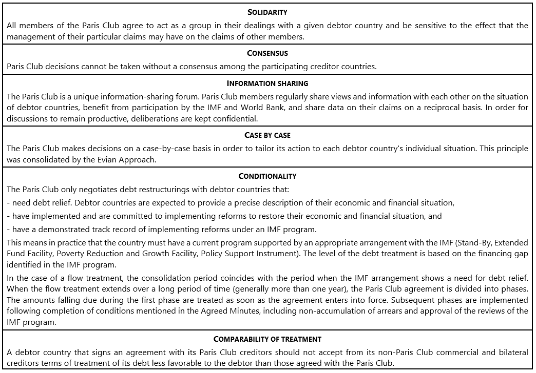 1. Comparability of treatment (CoT) is a fundamental principle underlying Paris Club debt treatment. According to this principle, a borrowing country that signs an agreement with Paris Club creditors should not accept from its non-Paris Club bilateral or commercial creditors terms of treatment less favourable to the debtor (hence more favourable to the creditor) than those agreed with the Paris Club. This principle has been adopted by the G20 Common Framework for debt treatments, which has also been endorsed by the Paris Club. By setting the minimum standards for other restructuring agreements, the CoT serves three purposes: