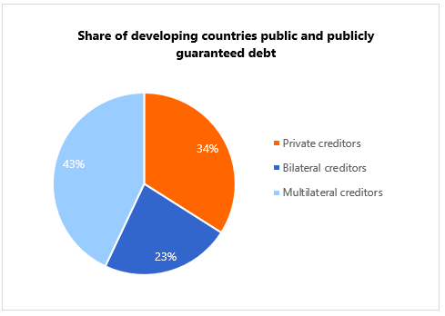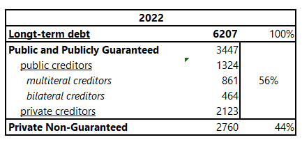 As of 31 December 2022, the total debt of developing and emerging countries was estimated by the World Bank to be $8,967 billion, out of which $6,207 billion of medium- and long-term debt, broken down as follows: