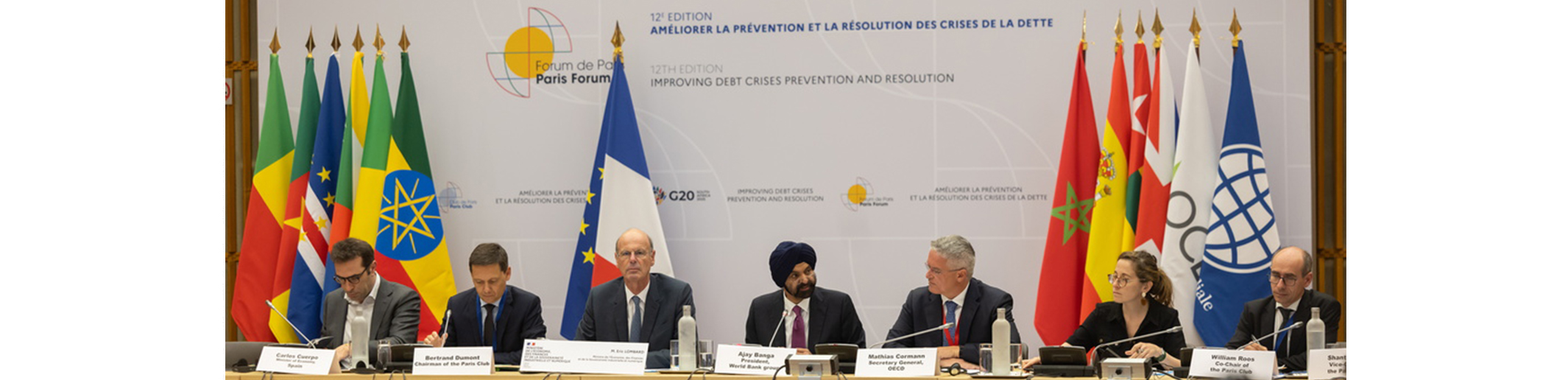Le Forum de Paris est une instance unique d’échanges entre créanciers (privés comme publics, membres du Club de Paris ou autres), pays emprunteurs, institutions internationales, chercheurs et ONG. Une vingtaine de pays emprunteurs ont participé à l’évènement – mais aussi, des associations et des ONG, des chercheurs et les représentants d’une quarantaine d’organisations du secteur privé, principalement des banques et des gestionnaires d’actifs exposés sur les marchés émergents et en développement. Le Forum s’est conclu par un panel de haut niveau réunissant Ajay Banga, Président du Groupe Banque mondiale, Kristalina Georgieva, Directrice du Fonds monétaire international (en vidéo), Éric Lombard, Ministre de l’Économie, des Finances et de la Souveraineté industrielle et numérique, Mathias Cormann, Secrétaire général de l’Organisation de la coopération et du développement économiques (OCDE) et Carlos Cuerpo, Ministre de l’Économie, du Commerce et des Entreprises de l’Espagne.